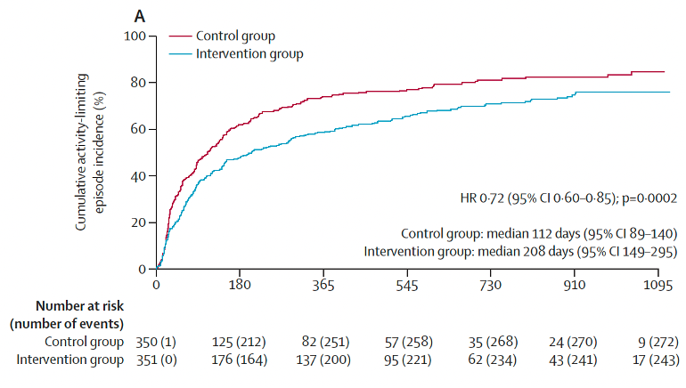 Both groups were followed up at 12 months and 3 years and were asked about their low back pain. The main result they looked for was; did the walking and education reduce the time between episodes of low back pain? The answer was yes! In the graph, the control group (group 2) averaged 112 days between episodes of back pain. Whereas the intervention group (group 1) averaged 208 days. Meaning people who had the walking program and pain education had an extra 96 days/3 months before another episode of low back pain.